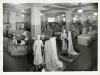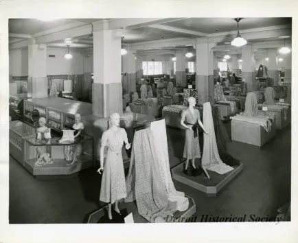 Print. Sepia-toned photographic print of an elevated interior view of the Fabric Department at The J.L. Hudson Company Department Store. Female mannequins are featured in the foreground, each wearing a lace dress, and featured adjacent to the mannequin are bolts of lace in differing patterns and colors. Bolts of differing styles, types, and patterns of fabric are visible throughout the department.