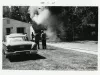 Black and white photo of a car fire in the driveway of a house, in front of the garage. The car is engulfed is smoke with two fire fighters putting the fire out. There are three men standing off to the side watching the fire fighters put out the fire. "Sep 67" is printed in the photo's border.