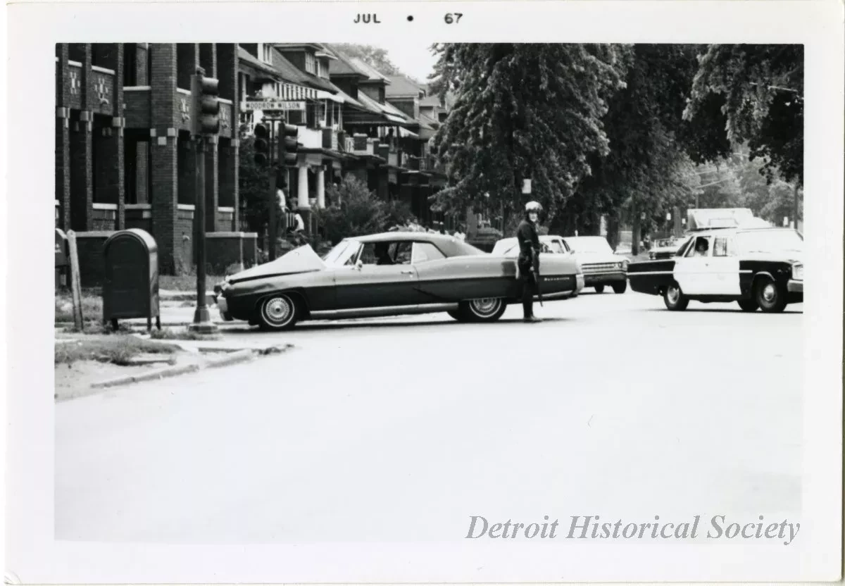 Black and white photo of a police officer beside a car stopped in an intersection along a residential stretch of Woodrow Wilson Street. The car has with damage to the hood and front. A police car is stopped in the center of the intersection. A man sits in the driver seat. "Jul 67" is printed in the photo's border.