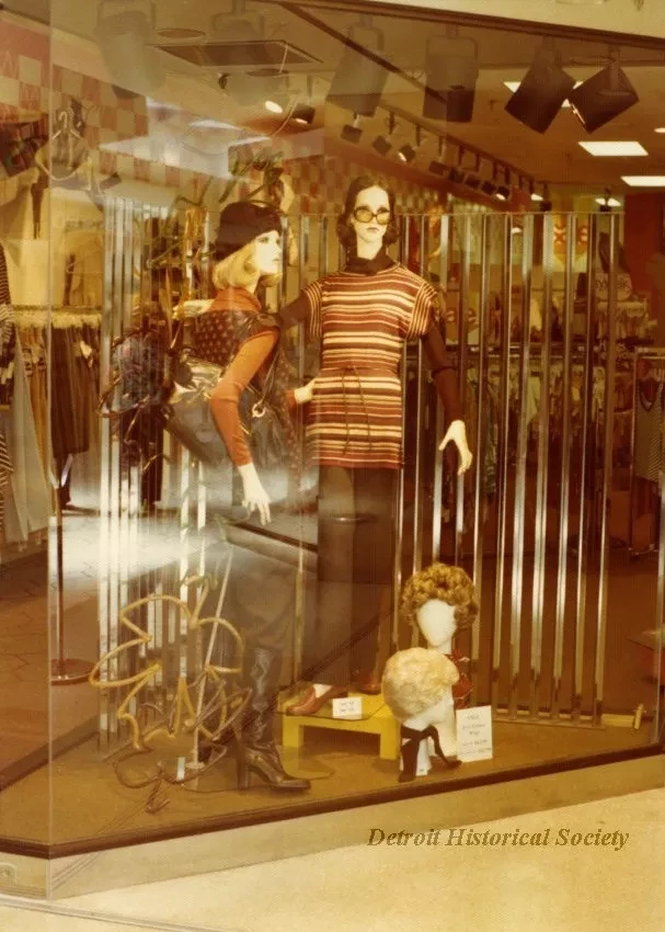 Color photo depicting a window display at Winkelman's store #46 at Briarwood Mall in Ann Arbor. From a scrapbook of store display mannequins.