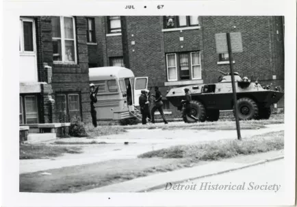 Black and white photo of several police officers in riot gear standing between the open rear door of a bus and a Cadillac Gage Commando armored car, on a road between two apartment buildings. They appear to be walking a man--presumably an arrestee--onto the bus. "Jul 67" is printed in the photo's border.