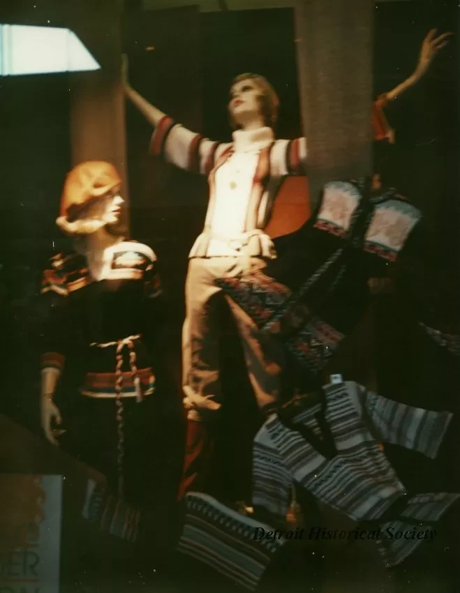 Color Photo depicting a window display at Winkelman's store #56 at Oakland Mall in Troy. From a scrapbook of store display mannequins.
