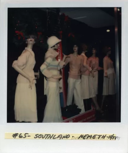 Color Polaroid depicting a window display at Winkelman's store #65 at Southland Center in Taylor. From a scrapbook of store display mannequins.