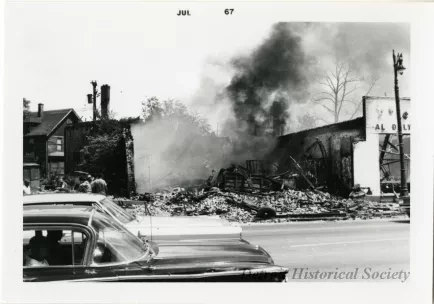 Black and white photo of the remains of the Al Daly Tire Company and a neighboring structure, both on the northeast side of Grand River Avenue between Linwood Street and Loraine Street, following a fire. Smoke still rises from the rubble. "Jul 67" is printed in the photo's border.