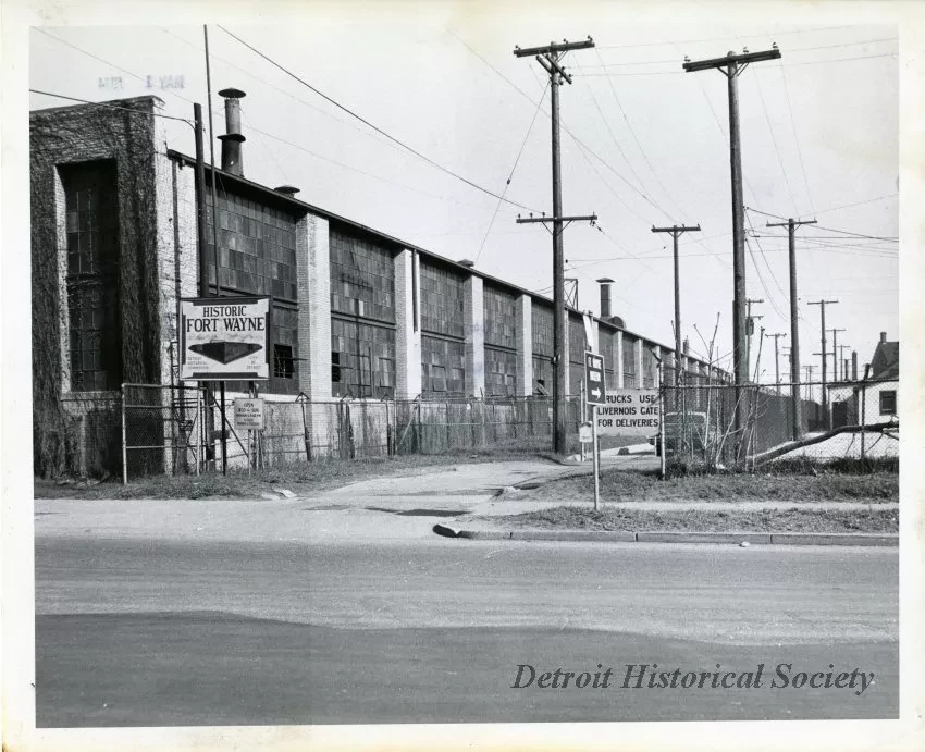 A black and white photo of Fort Wayne entrance. The photo shows a long view of the Revere Copper and Brass main building at the intersection of Jefferson and Calvary. A fence seperates the building from Fort Wayne property. A sign in the foreground reads "Historic Fort Wayne." On the verso is a datestamp: "May 1, 1974" and a stamp that says: