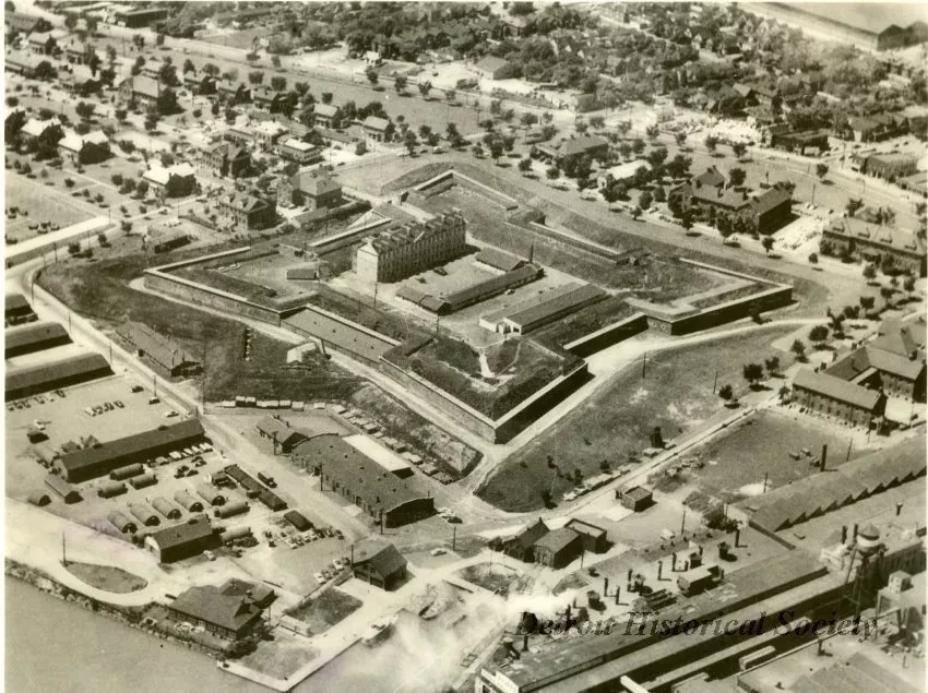 A black and white aerial photo of Historic Fort Wayne viewed from the southeast that shows an excellent view of the fort's star shape. Military Quonset huts are in the left foreground. The original photo was framed in plexiglass.
