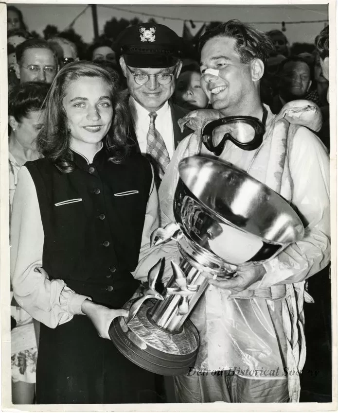 Black and white photo of Joan Mulford presenting the O.J. Mulford Silver Cup to the 1947 winning driver, Dan Arena, pictured in his life jacket and goggles. In the center of the photo is John Mulford. Dan Arena won the race driving Herb Mendelsohn's NOTRE DAME.