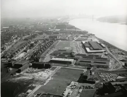 Request ImageA black and white aerial photo of the industrial area around Fort Wayne looking toward the Ambassador Bridge. The fort is visible in the center of the photo.