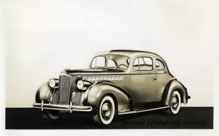 Black and white prints and negative. Illustrated, oblique front/side view of a Packard 110 Club Coupe. The image is dated February 7, 1940.