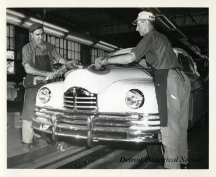 Request ImageBlack and white print depicting convertible being buffed by two workers on the Packard assembly line. Labeled August 7, 1947.