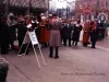 One color photograph of the Edison Glee Club singing at a street corner in Holly, Michigan, in December, 2001. The photo shows a group of about 20 singers who are dressed in winter clothing and are standing in a loose semi-circle as they follow the lead of their conductor. A portable "Edison Glee Club" sign can be seen next to the group. Several buildings are visible in the background along with evergreen roping and Christmas decorations. Handwritten ink text on the verso shows "EGC [Edison Glee Club], Dec., 2001, Concert in Holly, Mich."