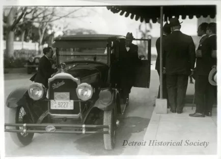 Black and white print of Francisco G. Peynado, President of the Santo Domingo Delegation exiting a Packard sedan with license plate:"USA A4 9227". License plate contains conference signage that reads:"Sexta Conferencia Internationale American". The vehicle is parked outside of an unknown venue in Havana, Cuba. Written on recto of photograph:"No. 20-Dr. Francisco G. Peynado, President of the Santo Domingo Delegation". Dated: c. 1928.