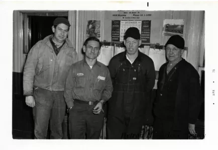 One black and white photograph of four Detroit Terminal Railroad employees. They are wearing work clothes and are standing in a railroad yard office building. Clipboards and a calendar can be seen on the wall in the background. Handwritten text in blue ink on the verso shows "1951" and "Jones - G. [George] Christopher - Doyle - Van Diver."