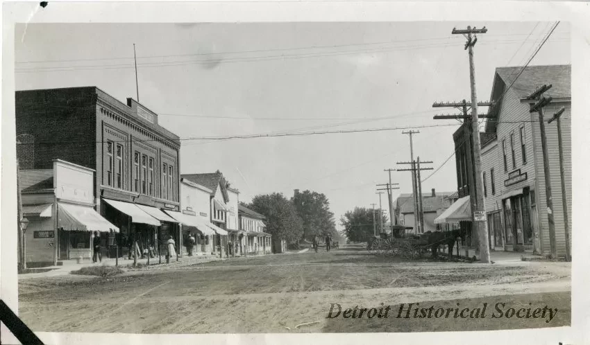 Black and white photo taken in Clarkston, facing south on Main Street at Washington Street. A grocery store and the Masonic Temple stand on the east side of the street, while a dry goods store and a mechanic stand on the west side. A sign posted on a utility pole advertises the Holly Chautauqua on August 8th through the 12th. Horse-drawn carriages and pedestrians are in view. "Clarkstone, Mich. 1915," is handwritten on the verso.