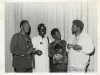 Black and white photographic print of Donald Byrd, standing to the right of a woman and two men, presumably Harold McKinney (left), and George Benson (center). The woman holds a copy of Byrd's album Street Lady, while Byrd and the two other men hold presentation boxes containing keys.