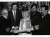 One black and white photograph of four men and one woman who are gathered at a celebration in Ludington, Michigan. Three of the men are dressed in marine officer's uniforms, one man is wearing a business suit, and the woman is wearing a dress with a vest. Captain Morgan Howell (far left) is receiving a Coast Guard pilot license from Capt. Fred Burgess, Jr., (far right) and Lt. Bill Romme (second from right) of the Coast Guard Merchant Marine Inspection Division. Captain Howell's wife, Grace, is at the center. Don Hannegan is looking on in the background (second from left). Wallpaper in the background has a woodland forest pattern.