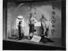 Print. Black and white photographic print of a window display featuring fashionable togs for young women, available at Kern's Department Store. Three teenage, female mannequins are wearing the latest fashions, including skirts, blouses, sweaters, and a plaid dress. Young ladies accessories are also featured and include shoes, and handbags. The mannequins appear to be participating in differing artistic activities including painting and playing the cello. Signage in the central foreground reads, "Practical And So Good Looking! Wash and Wear Togs, In Orlons-Dacron Combinations for the Back-to-School Crowd! Subteen Shop, Second Floor, The New Kern's." The photographic sequence number, and the photographer's name are printed on the bottom of the recto, "27872-2x; Photography by Davis B. Hillmer."