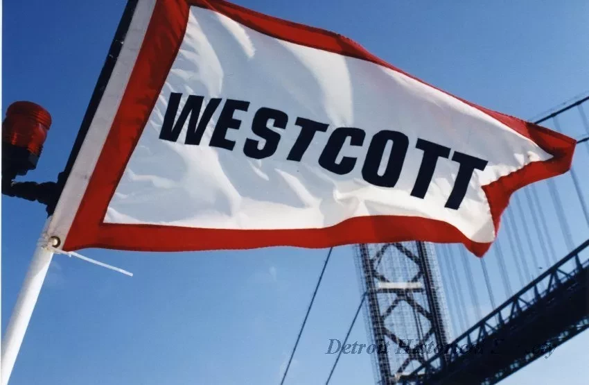 One color photograph of the J. W. Westcott Company pennant. The pennant has a white field with a red border and the name, "Westcott," shown in blue letters across the center. The pennant is tied to the light mast of the mailboat, J. W. Westcott II, and is fluttering freely on a breezy, sunny day. The Ambassador Bridge and a blue sky can be seen in the background.