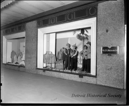 Print. (2 Copies.) Black and white photographic print of the façade and window displays of The J.L. Hudson Company Department Store. The display window in the foreground features a series of young boy mannequins dressed in the latest fashions. Signage in the central foreground of the window reads, "It's Springtime in The Boys' Store, For Smart Ensembles - Sports and Casual Coats With Contrasting Slacks, Sizes 12 to 22." The window in the background features men's wear. Signage affixed in the foreground of both windows reads, "Buy U.S. War Savings Bonds, For Immediate Delivery, War Bonds, 11th Floor, Section D." A plaque affixed to the exterior wall of the department store reads, "The J.L. Hudson Co."