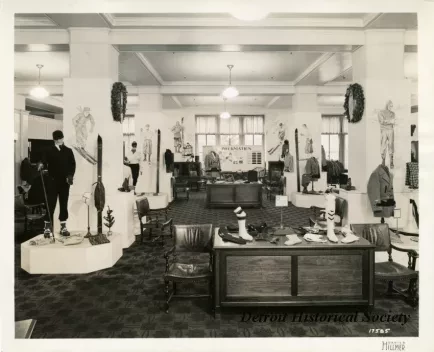 Print. Sepia-toned photographic print of an interior view of the men's outwear and sportswear department at The J.L. Hudson Company Department Store. Displayed in the foreground atop a table are differing styles of ski socks, a small sign in the center-rear of the display reads, "It's Christmas Time at Hudson's, Fine Domestic and Imported Ski Accessories." Arm chairs are featured throughout the department. Mannequins adorned in ski apparel, complete with boots, and poles are visible throughout the department. Ski coats, scarves and hats are also presented adjacent to pilasters and atop the table display in the rear. A large information board is visible in the background. Holiday wreaths are affixed to pilasters around the department. The photographic sequence number, and photographer's name are printed on the bottom of the recto, "17585; Davis B. Hillmer."