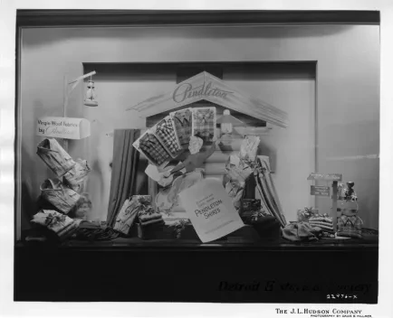 Print. Black and white photographic print of a window display featuring Pendleton Shirts available at The J.L. Hudson Company Department Store. A series of plaid shirts are featured under the gable of a log cabin; a young man in western wear is smiling back at the window. A lantern hangs above signage and a series of shirts, the sign reads, "Virgin Wool Fabrics by Pendleton." The right side of the window also features a series of shirts, and a small western man figuring climbing a fence, and a sign which reads, "Shirts by Pendleton, American's Finest Wool Shirts." Also, signage in the central foreground of the window reads, "It's Christmas Time at Hudson's, Present Him with Snug, Warm, PENDLETON SHIRTS, for Winter Hours Out of Doors - Men's Store, Second Floor, Grand River." The photographic sequence number, company name, and photographer's name are printed on the bottom of the recto, "22976-x; The J.L. Hudson Company; Photography by Davis B. Hillmer." The date is hand-written on the verso, "1947."