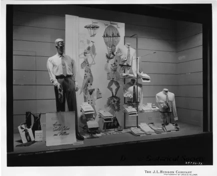 Print. Black and white photographic print of a window display featuring men's dress shirts available at The J.L. Hudson Company Department Store. A male mannequin stands on the left side of the window dressed in a pair of trousers, a dress shirt, and patterned tie; he holds a dress shirt in his hand as well. Differing colors, and patterns of men's dress shirts are displayed throughout the window, some are draped over mannequin busts and feature patterned neckties. A large mural of circus animals are visible in the background and include a lion, hot air balloons, a dog, and circus performers, it reads, "Arrow Style and Color Show." A display of silk neckties is featured left of the mannequin; accompanying signage reads, "Smart Arrow All-Silk Ties, $2.50." Also, signage in the left foreground in front of the mannequin reads, "You'll be amazed at the variety of Arrow Solid Colors and Patterns, waiting for you to pick from in our large selection! Men's Store, First Floor, Grand River Section A." The photographic sequence number, company name and photographer's name are printed on the bottom of the recto, "25750-5x; The J.L. Hudson Company; Photography by Davis B. Hillmer."