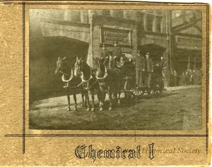 Mounted, sepia-toned photographic print of four crew members of Chemical Company No. 1 posing on their fire engine, drawn by a team of three horses in front of the Fire Department Headquarters. A crowd is visible in the background near the right edge. The matting is decorated with four pairs of intersecting lines which surround the photo, and "Chemical 1" is a blackletter script beneath it.