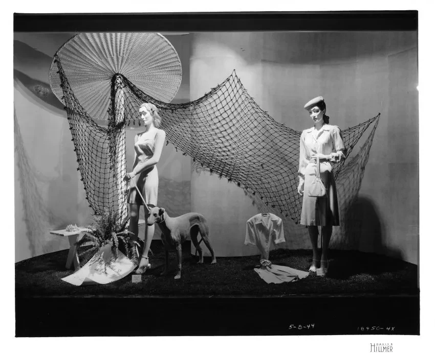 Print. Black and white photographic print of a window display which features ladies daytime fashions available at The J.L. Hudson Company Department Store. Two female mannequins are featured in the display, the mannequin on the right is dressed in a knee-length skirt, button down blouse, and is accessorized with a hat, handbag and peep-toe sandals. The mannequin on the left side of the display is featured in shorts, and a sleeveless top, she too is wearing peep-toe sandals, and is walking a dog. A third ladies outfit is featured at the foot of the right mannequin and is a skirt and blouse combination. Fix netting is draped throughout the display, and signage featured underneath a fern in the left foreground reads, "The Play Clothes Shop is Open! Fifth Floor!" The date, photographic sequence number, and photographer's name are printed on the bottom of the recto, "5-8-44; 18950-4x; Davis B. Hillmer."