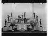 Print. Black and white photographic print of a window display featuring a series of dolls dressed in the latest Nelly Don Fashions available at The J.L. Hudson Company Department Store. The dolls are featured a series of stepped platforms, and each is wearing a knee-length dress with a belted waist, and collar. Also, each doll is accessorized with a hat, and footwear. Urns of flowers decorate the foreground. Also, signage in the foreground reads, "PREVIEW Fall Nelly Dons, See the in sizes for Misses and Women, in the Wash Frock Shop, Fifth Floor, Woodward." The photographer's name is printed on the bottom of the recto, "Davis B. Hillmer."