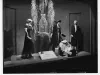 Print. (2 Copies.) Black and white photographic print of a window display featuring ladies day and outerwear available at The J.L. Hudson Company Department Store. Three female mannequins are dressed in the latest fashions for travel; featured on the left mannequin is a short sleeve A-line dress with a cinched waist, and scalloped collar with matching detail on the sleeves; a suit is featured on the right mannequin which includes a straight skirt, box-style jacket with piping on the edges, notched lapel, and light-colored blouse. The center mannequin is donned in a printed dress with a bow collar and belted waist; also featured on the mannequin is a dark colored overcoat with a cuffed sleeves, front button enclosure and a notched lapel. A bird cage adorned with laurel branches hangs from the ceiling, and a sign affixed to the cage reads, "A Perfect Wedding for a Perfect Pair." Featured in the right foreground is a display of ladies accessories including luggage, outerwear, and knit tops. Signage in the central foreground reads, "Bride's Week - a tradition at Hudson's, by planning your Trousseau, achieve an integrated wardrobe based on Color Scheming for a correlated effect, here coordinated in color; The Going-Away Coat, The Going-Away Suit; The Afternoon Dress, Woodward Shops 7th Floor." The date, photographic sequence number, company name, and photographer's name are printed on the bottom of the recto, "2-23-53; 25649-4x; The J.L. Hudson Company; Photography by Davis B. Hillmer."
