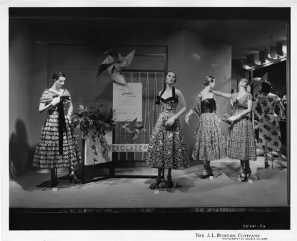 Print. Black and white photographic print of a window display featuring ladies summertime evening dresses available at The J.L. Hudson Company Department Store. Four female mannequins are featured in the display, and each is dressed in a mid-calf length dress with an A-line bottom. The bold-patterned dresses each feature a differing style of top and neckline, which include strapless with a wrap, halter top with a sweetheart neckline, and a plunging V-neck with cap sleeves. Accessorizing the ladies are clutch handbags, jewelry, and strappy sandals. Pinwheels ornament the signage in the background which reads, "Because It's Everglaze, It Stays and Stays, pert, pretty Summer fashions, remarkably resistant to spotting and soil wrinkle resistant too, and of course completely washable, Evening Dresses, 6th Floor, Woodward Section D." The photographic sequence number, company name, and photographer's name are printed on the bottom of the recto, "25681-5x; The J.L. Hudson Company; Photography by Davis B. Hillmer."