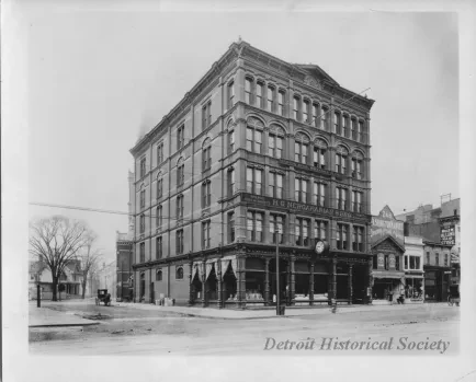 Black and white photograph of the exterior facade of the David Whitney Building, built 1884, corner of Clifford and Woodward, which includes the businesses of Newton Annis, Wholesale Furrier; H.G. Nergarian and Brothers; O'Neil and Hoffner; D.S. Marshall; and Charles Watson.