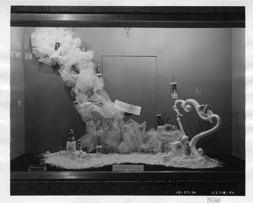 Print. Black and white photographic print of a window display which features ladies Odalisque Perfume available at The J.L. Hudson Company Department Store. A smattering of tulle is affixed to the rear of the display and draped along the backside, and features boxes and bottles of Odalisque perfume. A small ornamental harp is visible on the right side of the window. More bottles and boxes are displayed across the foreground. Signage affixed to the rear of the display reads, "Nettie Rosenstein's Odalisque Perfume, Welcome 1947 with its Heavenly Aura, Perfumes - First Floor, Woodward." Signage in the central foreground reads, "The J.L. Hudson Company." The date, photographic sequence number and the photographer's name are printed on the bottom of the recto, "12-27-46; 22718-4x; Davis B. Hillmer."