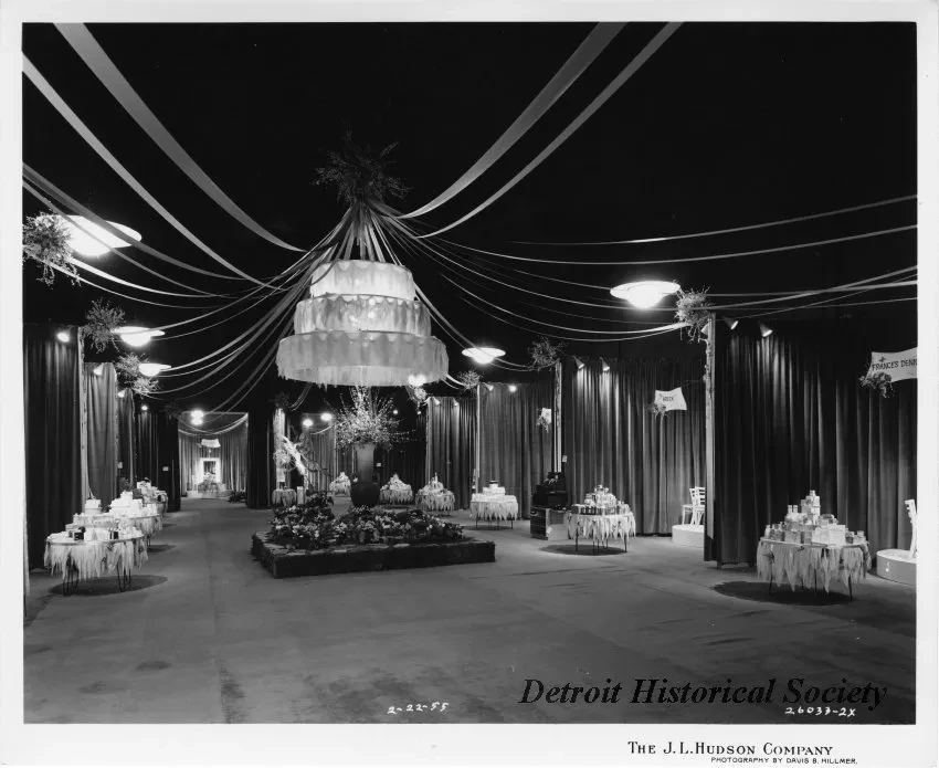 Print. Black and white photographic print of an interior view of the auditorium set for a beauty products show at The J.L. Hudson Company Department Store. A large tiered lantern hangs from the ceiling with swags of ribbon connecting to the ceiling perimeter. Tables draped with table clothes feature the latest from ladies perfume cosmetic companies which include Breck. The date, photographic sequence number, company name and the photographer's name are printed on the bottom of the recto, "2-22-55; 26033-2x; The J.L. Hudson Company; Photography by Davis B. Hillmer."