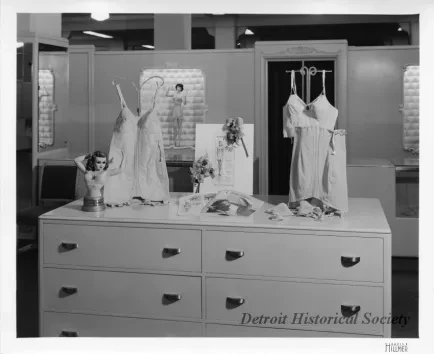 Print. (2 Copies.) Black and white photographic print of an interior view of the fifth floor, ladies lingerie department located inside The J.L. Hudson Company Department Store. Visible atop the retail display are two differing options of ladies foundations including a full length corset with attached brassiere on the left, and visible on the right is the separate girdle and brassiere. A figurine in the left foreground of the display is of a young woman wearing a brassiere, it reads, "Life by Formfit." Signage for Formfit Creations is visible between the two displayed foundations." Recessed displays of more foundation options are visible in the background. The photographer's name is printed on the bottom of the recto, "Davis B. Hillmer."