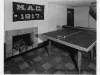 Print. Black and white photographic print of a recreation room or basement interior at an unidentified location. The room features a bricked fireplace, and Ping-Pong table; a banner affixed to the wall reads, "M.A.C. 1917;" ribbons affixed to the banner read, "20th Reunion, A.H. Hichol, Pretty Keen, M.S.C., '17." A staircase is visible in the right background.