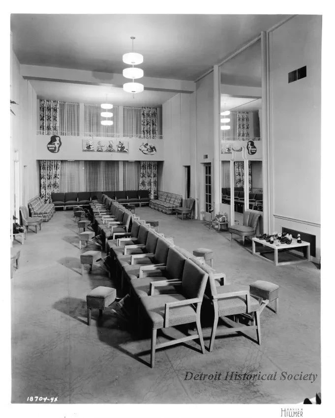 Black and white photographic print of an interior view of the Children's Shoe Department located inside Fyfe's Department Store. Upholstered seating is visible throughout the department; playful children's imagery is affixed far and right walls. Differing styles of shoes are visible on a small display table on the far right side of the department. The photographic sequence number and the photographer's name are printed on the bottom of the recto, "18704-4x; Davis B. Hillmer."