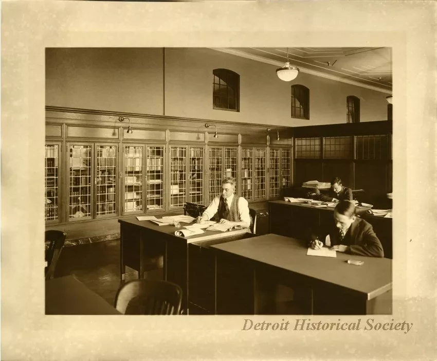 Sepia toned photograph printed on heavy paper with approximately 1.25" wide borders. Shows a large office (or reference library) inside the Detroit News Building, including three men seated at desks and a row of glass door encased bookcase along the wall.