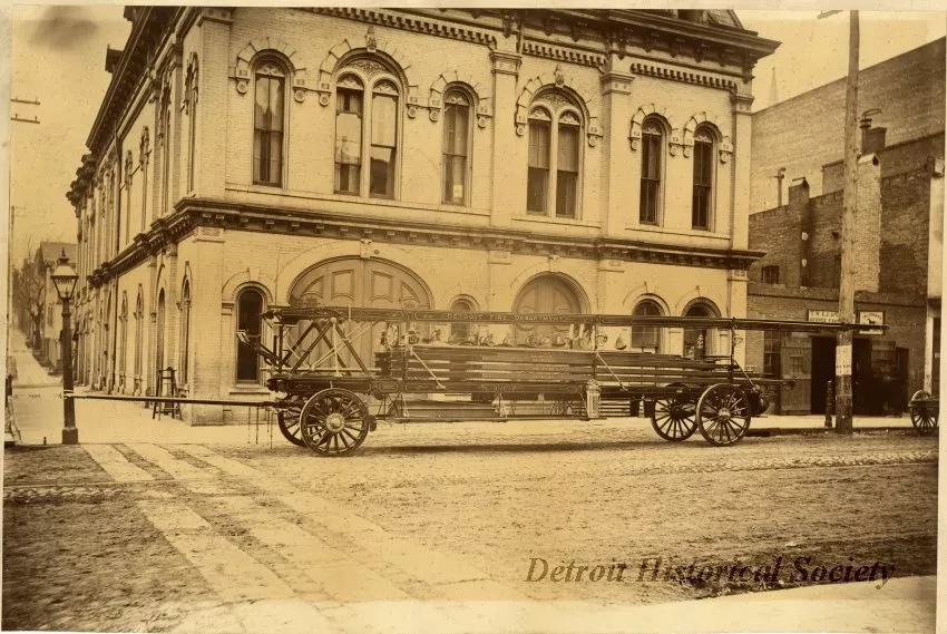 Sepia-toned albumen photo of a Detroit Fire Department horse-drawn ladder truck that is parked on Larned Street in front of the Fire Department Headquarters building. The old headquarters building was located at the corner of Wayne (now Washington Blvd.) and Larned St. and the name, "Larned," can be seen on the glass of the streetlight that is located on the left side of the photo. "Fire Department Headquarters" is written over the arched doorway that is located at the far right side of the ornate 3-story brick building. The shop of horseshoer, T. W. Leonard (Thomas W. Leonard, 78 Larned St. W.), can be seen just to the right of the headquarters building. Handwriting on the verso notes "The new 1883 Hayes-LaFrance 86' aerial truck of 'Rescue' Hook & Ladder Co. No. 1 in front of original fire headquarters. The large aerial ladder was raised by cranking the long worm gear attached to the turntable. The rear steersman (tiller) was seated at the rear over the wheels and under the main ladder."