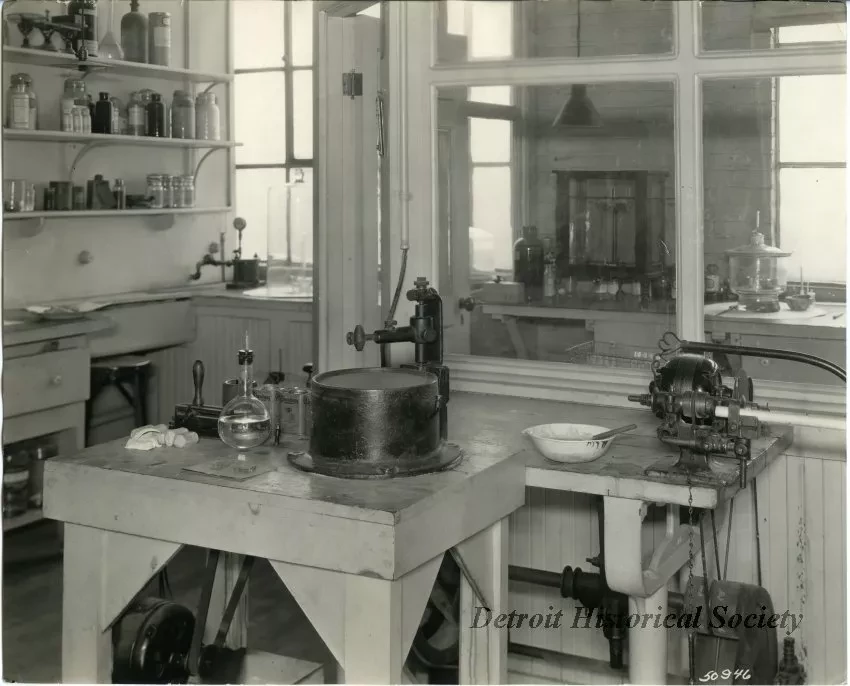 Black and white photographic print depicting equipment in the Chemical Laboratory at the Champion Spark Plug Co.