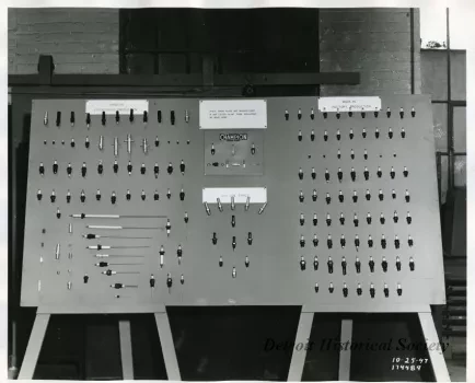 Black and white photographic print depicting a display of Champion Spark Plugs. Items are labeled, "Made in Engineering Production", "Made in Factory Production", "Aviation Types", and "These spark plugs are manufactured in our Toledo plant from insulators we make here".