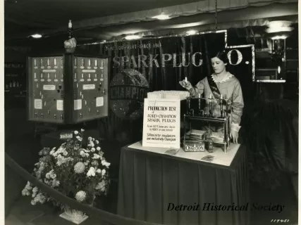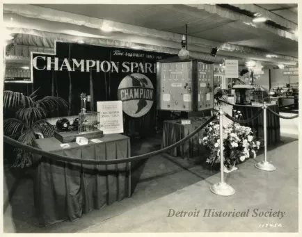 Black and white photographic print depicting a Champion Spark Plug Co. product display at a trade show. Signs read, "Mechanical Strength Test, Ford-Champion Spark Plugs, An Outstanding Advantage of Champion Sillimanite Insulators" and "A Production Test of Ford-Champion Spark Plugs, From 100 F. below zero dry ice to 1800 F. in one minute, Silliminite insulators are exclusively Champion". The backdrop reads, "Ford Equipment Since 1911".