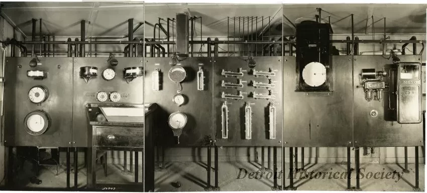 3 black and white photographic prints mounted together on fabric depicting a panoramic view of the control board for the Dressler kiln at the Champion Spark Plug Co.