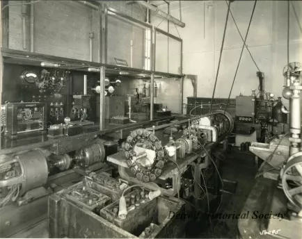 Black and white photographic print mounted on fabric depicting equipment in the electrical laboratory at the Champion Spark Plug Co.