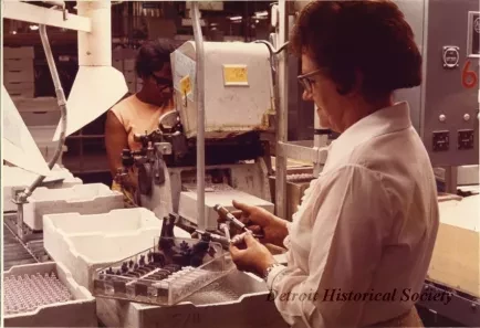 Color photographic print depicting a woman inspecting insulators at the Champion Spark Plug Co. In the background, a woman operates a turning machine.