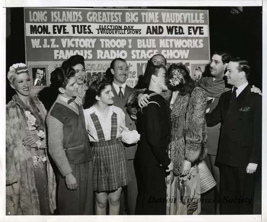 One black and white photograph in which 10 people stand on a stage with 8 looking on as a man and woman kiss. The man wears a sailor uniform while the woman wears a long, floral dress with a fur coat and a flower in her hair. They stand in front of a sign which reads, "Long Island's Greatest Big Time Vaudeville; Mon. Eve. Tues. Election Day / 3 Vaudeville Shows, and Wed. Eve; W.J.Z. Victory Troop! Blue Network's Famous Radio Stage Show." Larry Marino stands just to the left of the couple and Toby David stands to the right. Handwritten text on verso states, "121,000,000 worth of bonds & 736 shows for armed services - entertained 5,000,000 boys."