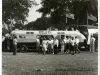 One black and white photograph of 18 people standing in front of the WJR mobile studio bus. One man stands off to the left lighting his cigarette, and another stands to the right while the others gather toward the middle. Four American flags can be seen behind the bus as well as trees and a small stage. Brown ink stamp on verso states, "Pinney Studio Brighton."