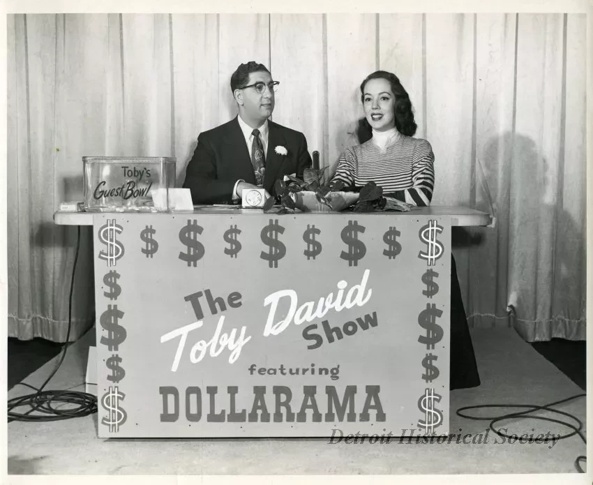 One black and white photograph showing Toby David (left) and an unidentified woman (right) sitting at a desk with a sign in front that reads, "The Toby David Show featuring Dollarama." The sign text is surrounded by dollar signs on the left, top, and right. At the left side of the photograph, a clear plastic bin rests on the desk and holds slips of paper. Text on the bin reads "Toby's Guest Bowl." David wears browline glasses and a flower in his lapel as he looks to his left. A smiling young woman is seated to his left and is wearing a striped blouse. There is a small plant in a bowl in between them on the desk.