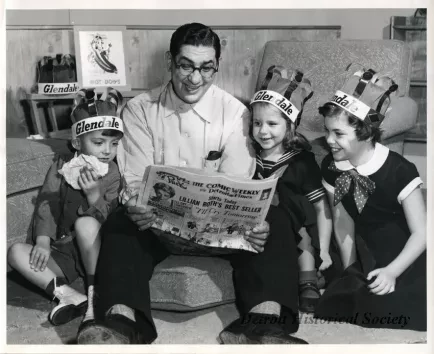 One black and white photograph of Toby David and three children who are sitting on the floor in a living room setting and are reading "The Comic Weekly" from the Detroit Times. The children wear paper crowns which say "Glendale" and smile as they look at the newspaper. David sits in the center with his feet forward and holds the paper with both hands. He smiles and looks down at the paper. In the background is a fourth "Glendale" crown and a poster which says "King of the Hot Dogs." Handwritten text on verso states, "Show on 10-24."