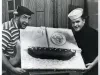 One black and white photograph of Toby David as Captain Jolly (left) and Paul Allen Schultz as Poopdeck Paul (right) standing on opposite sides of a cake. The cake is shaped like a sail boat and has an image of Popeye on the sail. Both men hold the cake and smile at the camera. Black ink stamp on verso states, "CKLW-TV Photographic 45-66-1." A typewritten note which accompanied this photograph states, "Toby David, as CKLW's 'Captain Jolly,' admires the giant birthday cake presented to him by General Manager Ernest G. Steck of the Detroit Statler Hilton, in celebration of the 'Popeye' cartoon's first year on the station. These are seen nightly on Channel 9 from 6:00 to 6:30 p.m., From left to right are Toby David ('Captain Jolly') and Paul Allen, who portrays 'Poopdeck Paul' on the show., From: A.R. Gloster Publicity Director CKLW."